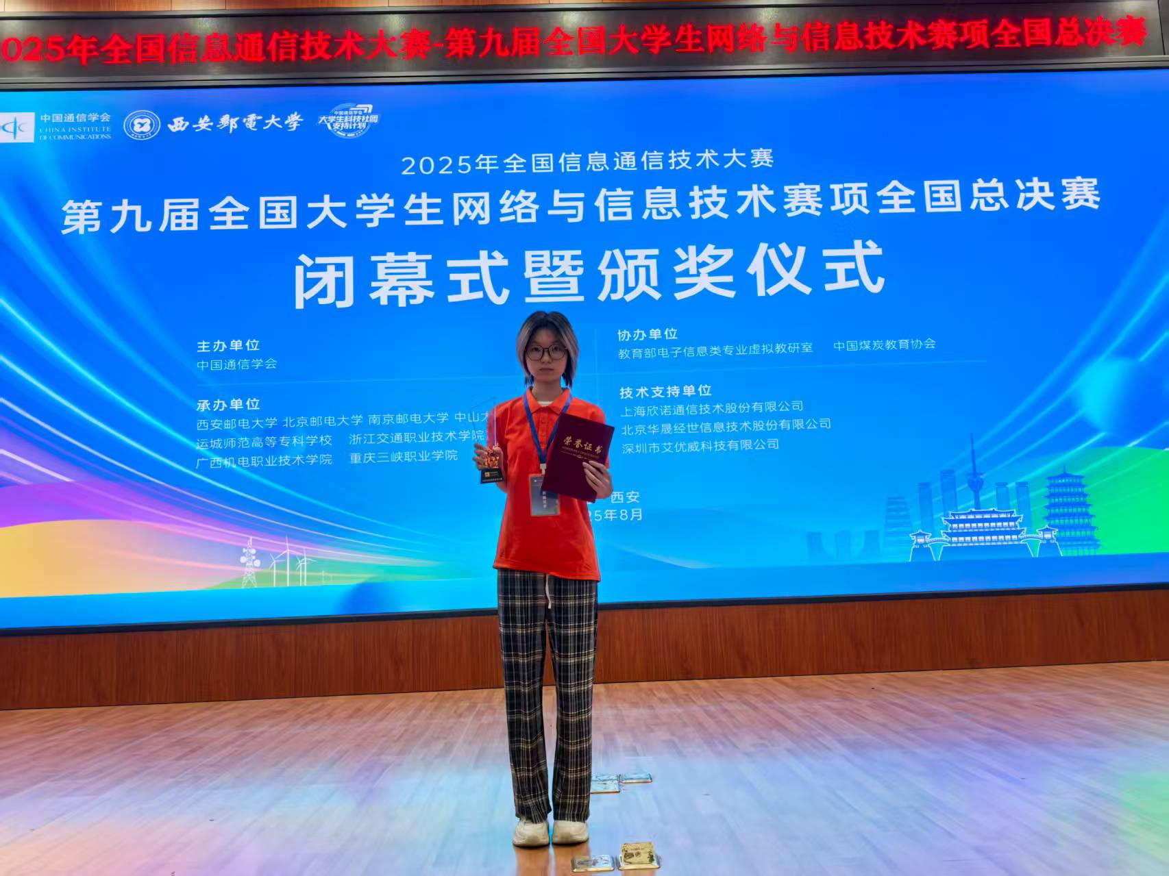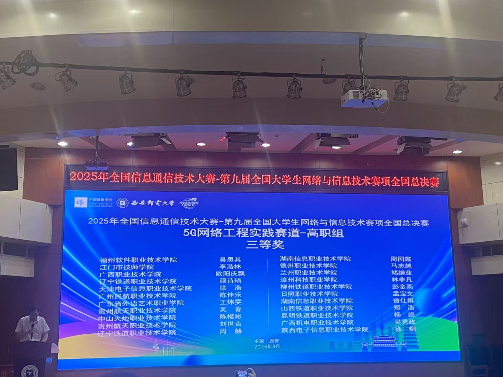 2025年全国信息通信技术大赛——第九届全国大学生网络与信息技术赛项的全国总决赛,成功在西安邮电大学隆重举办。来自全国各地的优秀学子们齐聚一堂,展开了一场精彩纷呈的智力较量。在这场充满竞争与挑战的赛事中,我院的吴思其同学凭借其卓越的技术实力和出色的临场表现,最终脱颖而出,荣获的国赛三等奖。