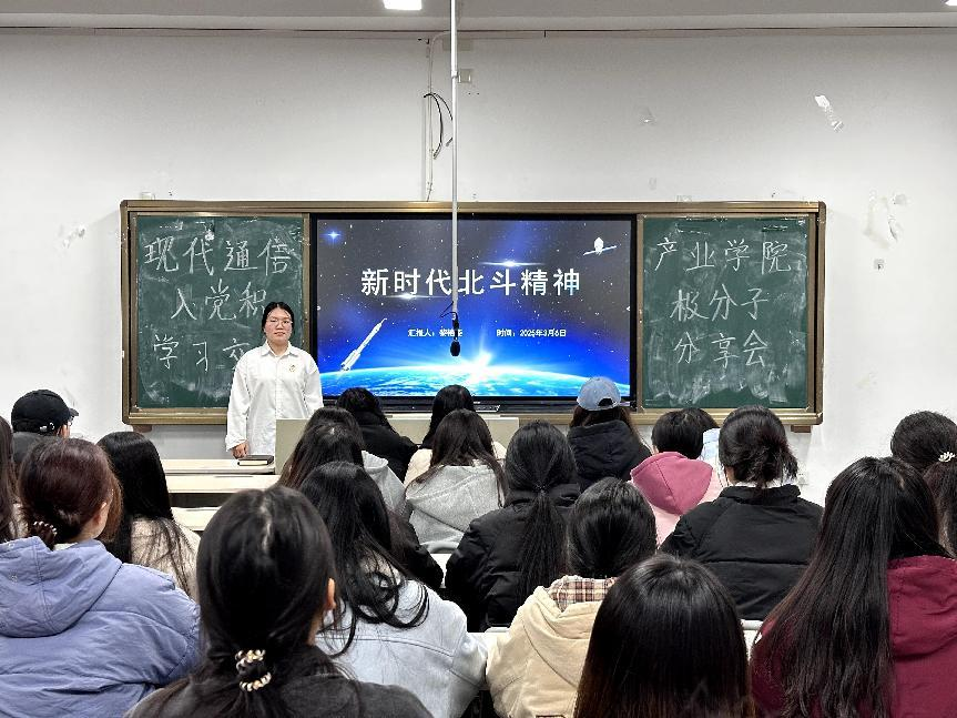 为贯彻落实习近平新时代中国特色社会主义思想和党的二十大精神,践行我院四色工程品牌建设,传承与发扬伟大的建党精神,积极弘扬新时代北斗精神,汲取砥砺前行的精神动力。3月6日晚21:10,现代通信产业学院学生党支部在教学楼开展入党积极分子分享交流会之“新时代北斗精神”主题学习会活动,2023级现代通信技术4班黎艳姿为本期学习会主讲人,全体学生党员、入党积极分子参与本次学习会。