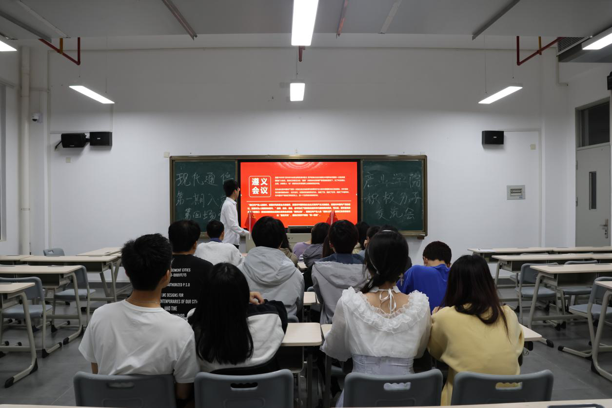为学习宣传贯彻党的二十大精神,深入宣传中国共产党人精神谱系,鼓舞激励入党积极分子们弘扬光荣革命传统、赓续红色血脉,4月14日晚20时20分,现代通信产业学院学生党支部在教学楼A611开展入党积极分子分享交流会之“遵义会议精神”主题学习会活动,智能互联网络技术2班刘海鹏同学为本期学习会主讲人,全体入党积极分子参与本次学习会。