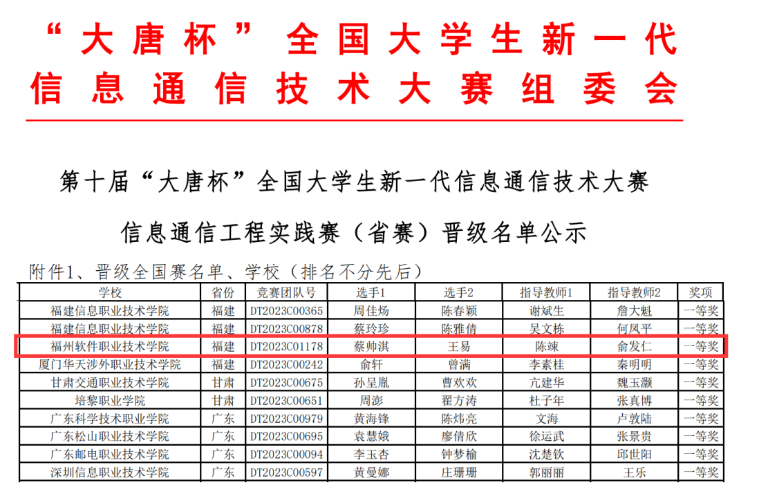 福州软件职业技术学院一直致力于培养具备专业知识和实践能力的高素质技术人才,此次蔡帅淇和王易的成功斩获也充分展示了我校学生在信息通信技术领域的优秀实力和才华。
